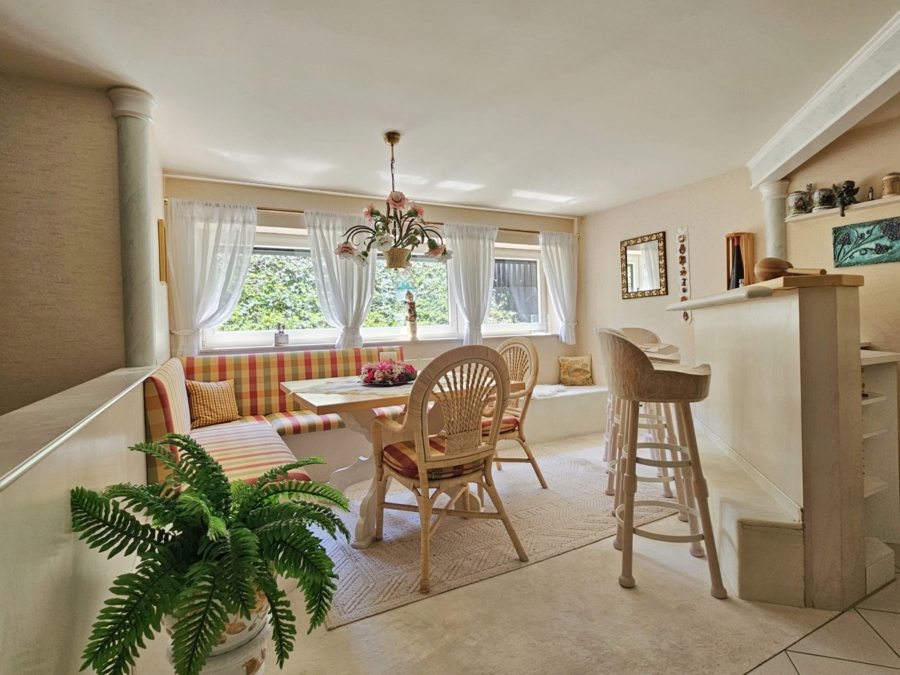 Bereits im Erdgeschoss überzeugt die Immobilie mit einer geschmackvoll integrierten, ländlich inspirierten und lichtverwöhnten Einbauküche. Daran anschließend öffnet sich der großzügig gestaltete Ess- und Wohnbereich, der durch einen behaglichen Kamin eine besonders wohnliche Atmosphäre erhält. Die angrenzende Terrasse erweitert den Wohnraum ins Freie und lädt zu erholsamen Stunden im Außenbereich ein. Im Untergeschoss stehen Ihnen rund 70 m² Nutzfläche zur Verfügung, darunter ein liebevoll gestalteter Saunabereich mit Wellnesszone, Ruheliegen, einer funktionalen Erfrischungsbar mit Eckbank, einem Tauchbecken sowie einer Mehrfachdüsen-Dusche – ein idealer Rückzugsort zum Abschalten und Entspannen.