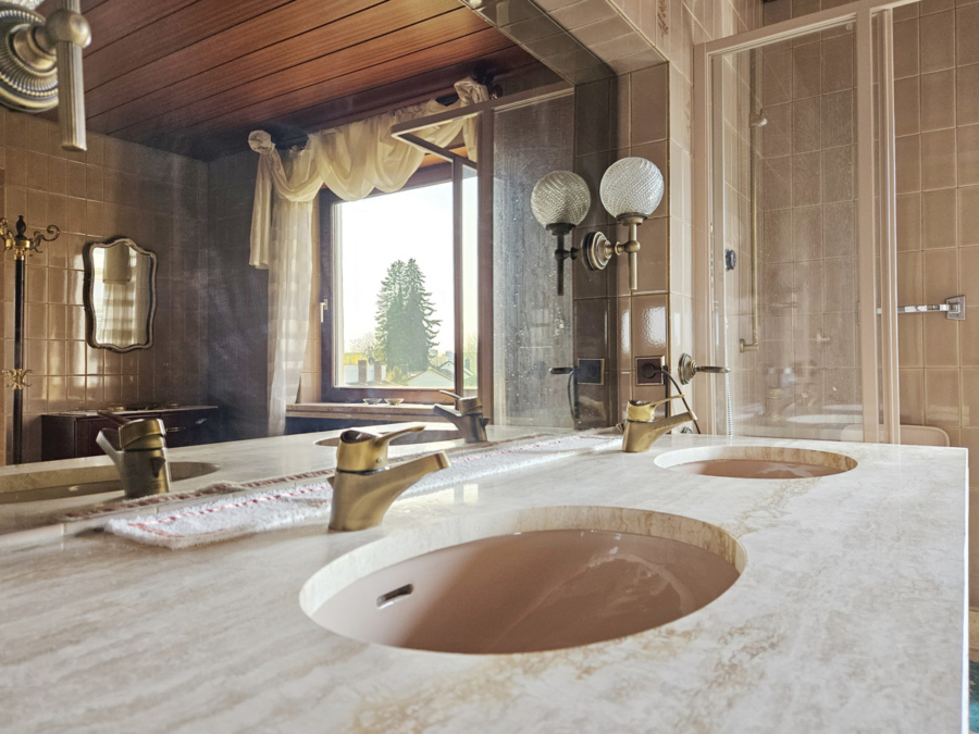Die Immobilie umfasst sieben Zimmer, inklusive drei komfortabler Schlafzimmer und zwei traditionell gestalteter, funktionsfähiger Badezimmer und zwei separeten WCs. Das vollständig unterkellerte Gebäude bietet nicht nur zusätzlichen Platz, sondern auch vielfältige Nutzungsmöglichkeiten. Im Obergeschoss befindet sich ein Gästezimmer, das mühelos in eine zweite Küche umgewandelt werden kann, da alle nötigen Anschlüsse bereits vorhanden sind.