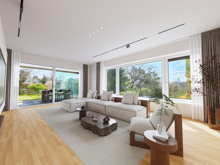 Das Bild "EG-Wohnzimmer Renovierungsvorschlag" ist einen Visualierungsvorschlag mit geweißten Wänden und einem Möblierungsvorschlag. Wand, Decke, Bodenbelag und Möbel entsprechen nicht dem Orginal. Das Bild "EG-Wohnzimmer" zeigt den Orginalzustand.