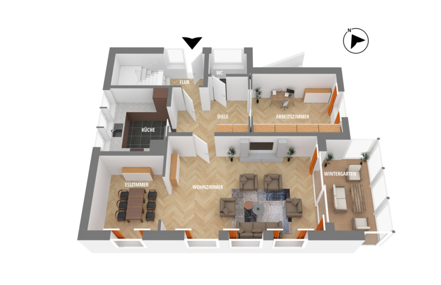 Die Böden im EG und OG sind größtenteils mit Echtholzparkett und Natursteinen ausgestattet.